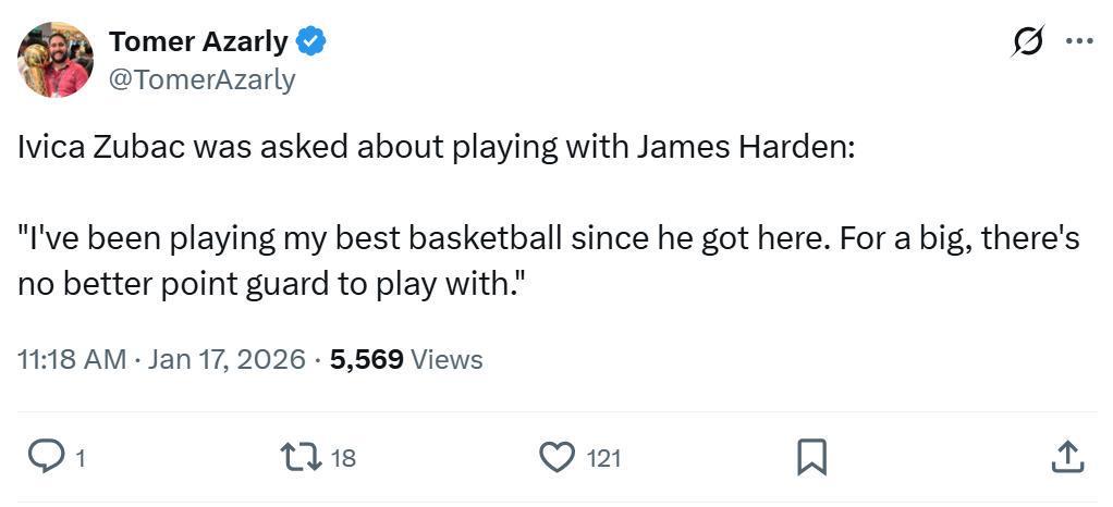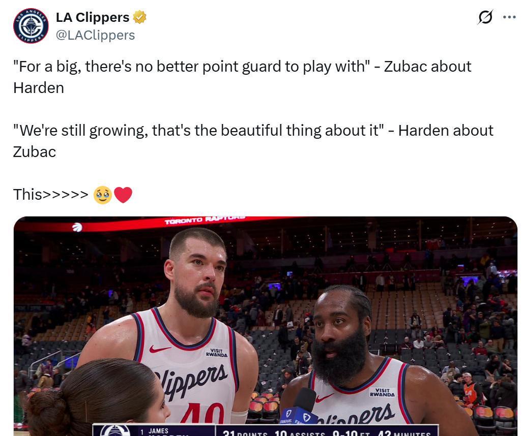 赛后祖巴茨也点名感谢哈登:“自从哈登加盟以来,他帮助我打出最好的篮球,对于大个球员来说,没有比他更好的控卫了。”