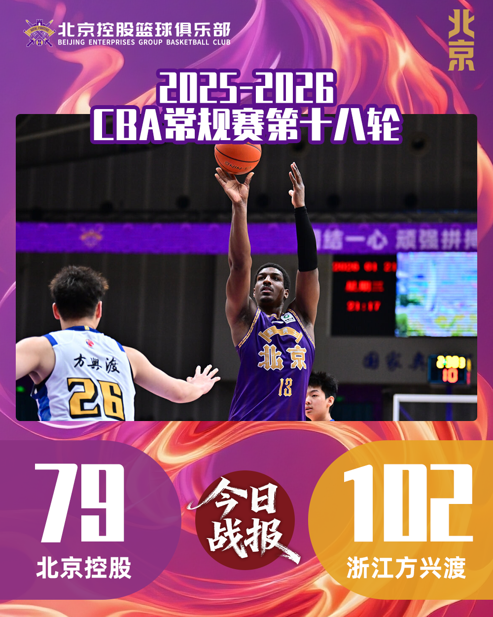 1月21日,北控男篮回到主场迎战卫冕冠军浙江方兴渡。 面对联盟领头羊,北控男篮在攻防两端均落于下风,全程遭对手压制,最终以79:102惨败。