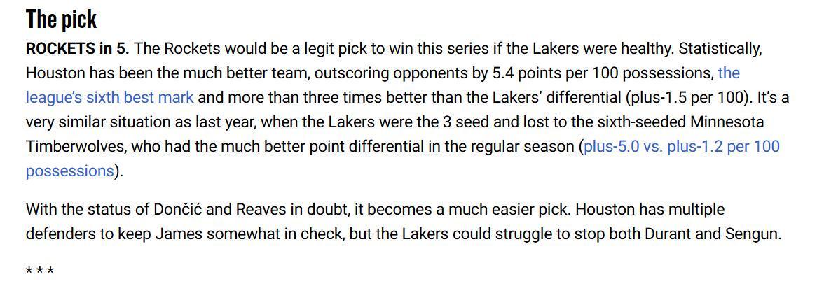 从常规赛阶段来看,湖人队净胜分仅为+1.5,与火箭+5.4差距明显,原因是湖人队往往需要拖到最后阶段,依靠三巨头的个人能力解决问题,这种模式原本非常适配季后赛,无奈东契奇与里夫斯先后受伤。